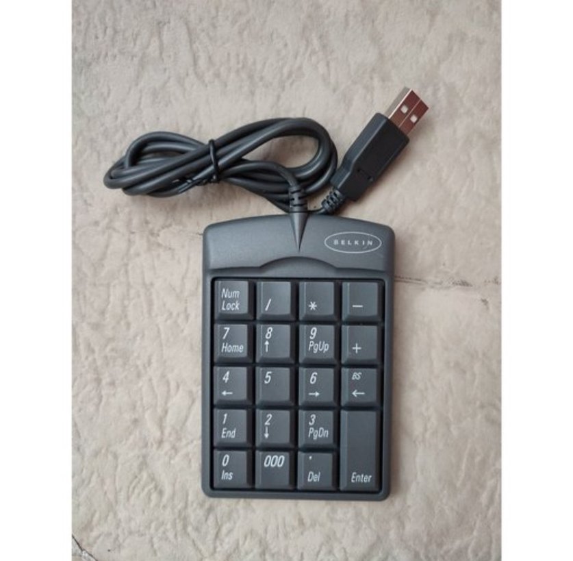 Belkin marka gri sayısal klavye, USB bağlantılı ve Num Lock, Enter gibi temel tuşları içerir. Masaüstü için pratik sayısal giriş sağlar.