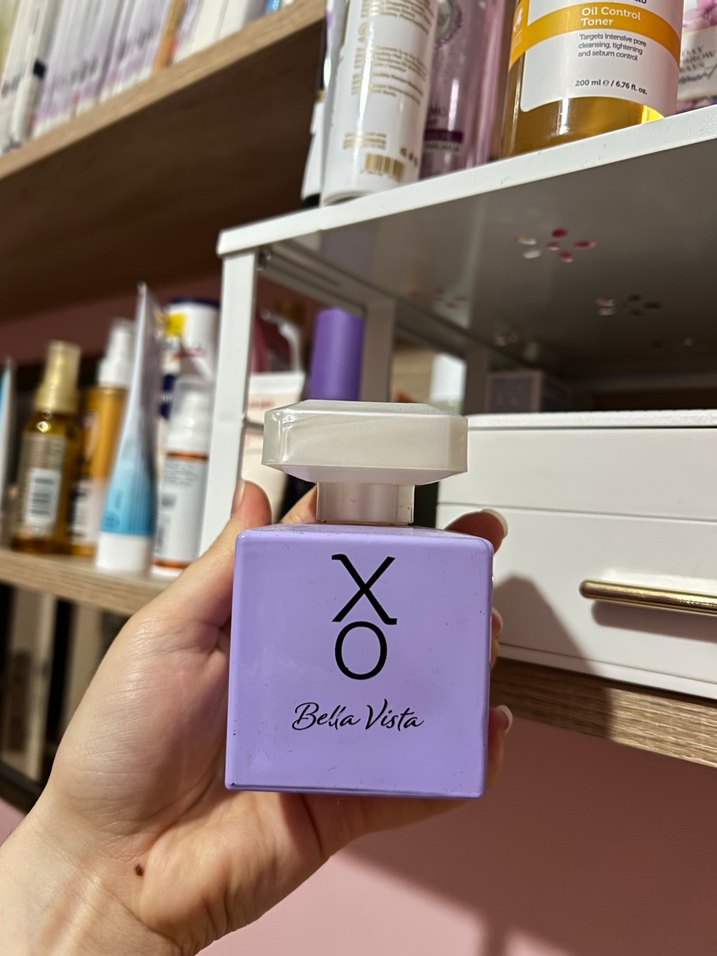BellaVista Xo kadın parfümü, beyaz kapaklı kare lavanta şişede sunulur, benzersiz bir koku deneyimi sağlar. Çok az kullanıldı