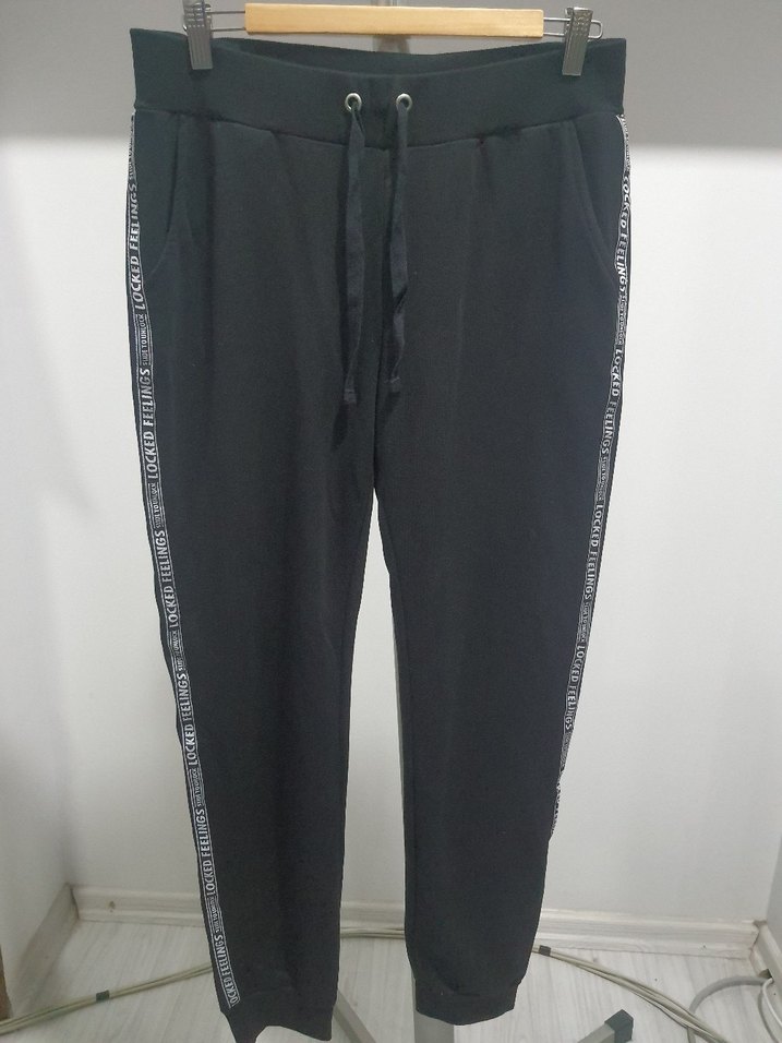 Belli bağcıklı, yan şeritlerinde yazı bulunan siyah kadın eşofman altı. Penye kumaştan, spor ve gündelik sokak tarzına uygun. Bel 41 cm. Boy 98 cm. kusursuz, tertemiz.