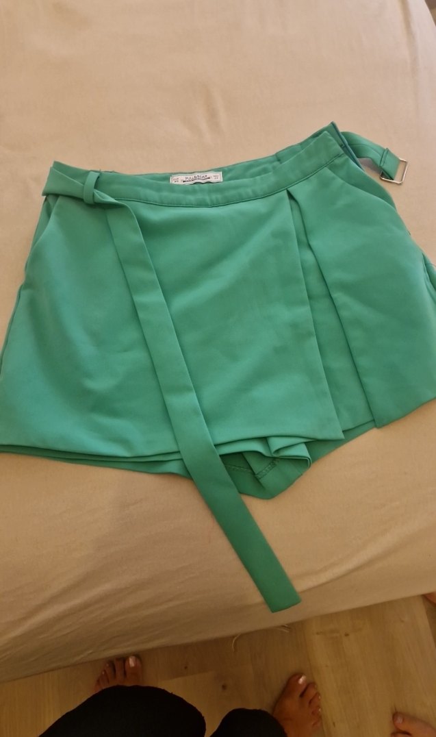 Sentetik kumaştan, beli bantlı ve bol kesim yeşil mini şortu. Pastel tonlarda, desensiz ve günlük sokak giyimine uygun.