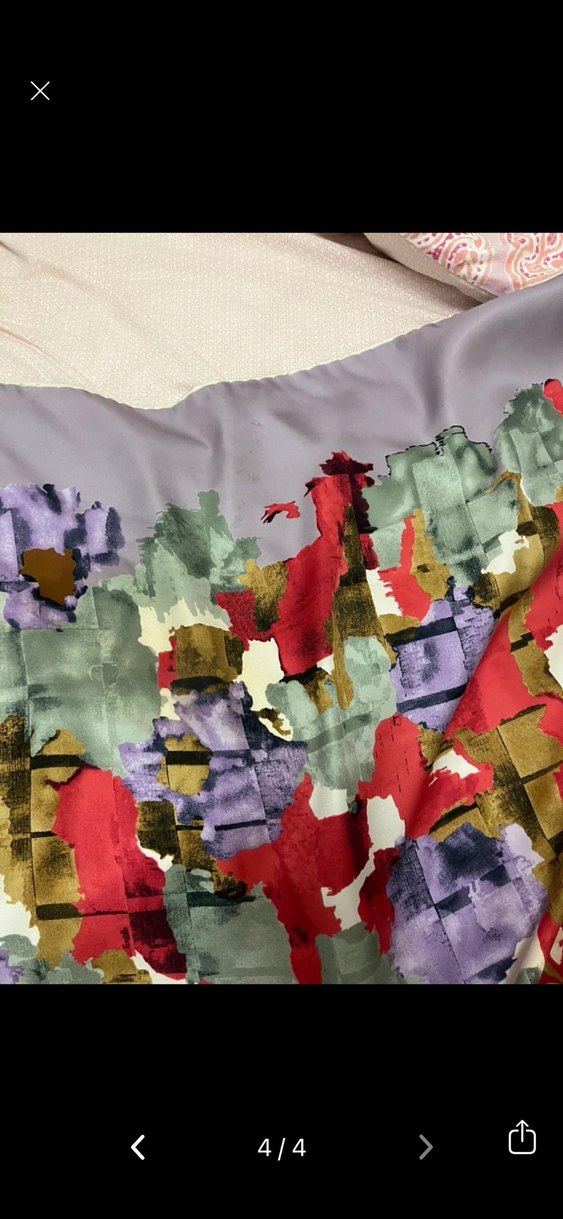 Kadın eşarp, lila zemin üzerine çok renkli soyut desenlerle drapeli tasarıma sahip, modern ve avangard tarz için uygundur.