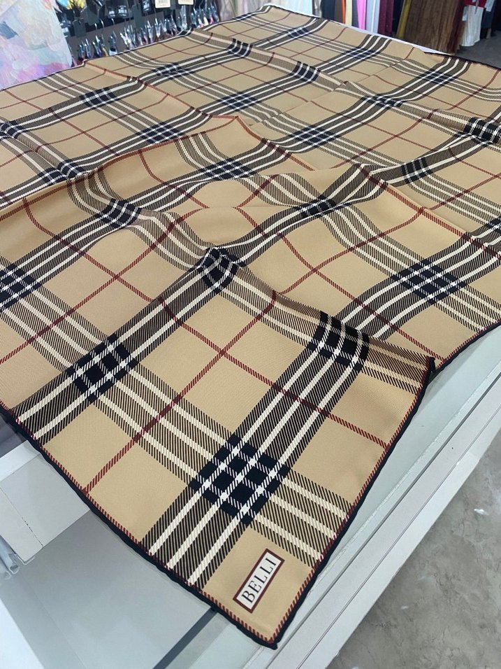 Kahverengi, pileli ve klasik kare desenli kadın fularıdır. Sentetik kumaştan yapılmış, koyu renk tonunda geleneksel bir stildir. Üzerinde 'BELLI' etiketi bulunur.