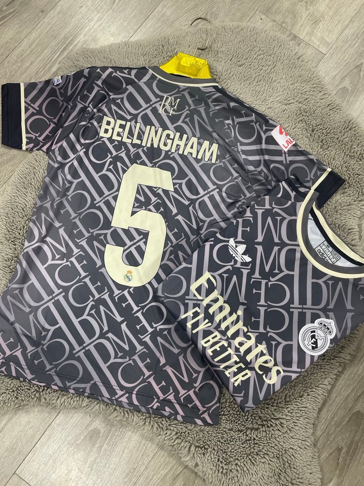 Erkek gri tişört, Bellingham ismi ve 5 numara baskılıdır. Kısa kollu, yuvarlak yaka, bol kesim ve örme sentetik kumaştan üretilmiştir. Spor ve günlük kullanıma uygundur.