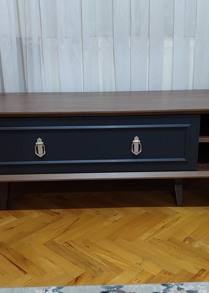 Alegro bellona tv sehpa ceviz antrasıt cekmece ve yan raflı ünite temiz ve az kullanıldı Eni 180 Boyu ayaklarla birlikte 51 Ceviz rengi orta cekmece lacivert renginde