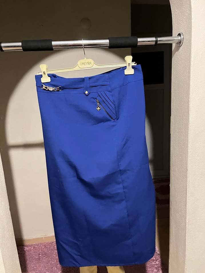 Parlak mavi, saten görünümlü kumaştan yapılmış, kemerli ve diz boyu, dar kesim kadın etek. Sokak stili ve iş ortamları için uygun.