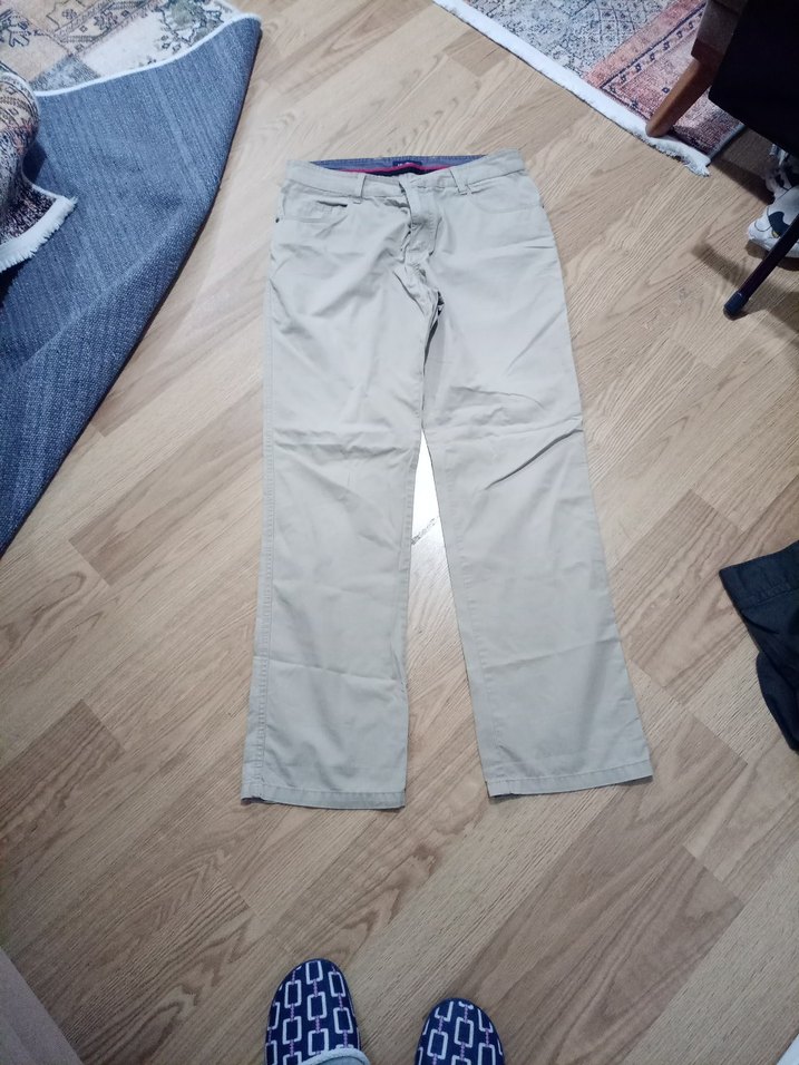 bej renkli, pamuklu kumaştan yapılmış regular fit erkek pantolon. Kemerli ve normal boyda, günlük rahat kullanım için uygundur. sadece belinde leke var yıkanınca çıkar kullanıms engel değil