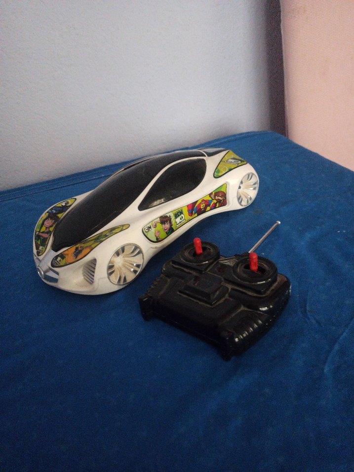Beyaz oyuncak araba koyu camlı ve renkli karakter çıkartmalarıyla. Siyah uzaktan kumandası ile kontrol edilir. sorunsuz çalışıyor arabada çatlak var ve kapak yok