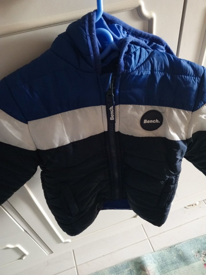 Bench erkek çocuk mont, Koyu mavi, beyaz, siyah baskılı tasarımıyla sokak stilini bir araya getiriyor.