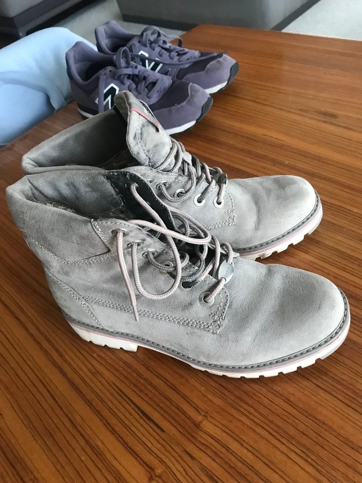 Gri süet malzemeden yapılmış, bağcıklı kadın botu. Günlük kullanım için uygun, desensiz ve normcore tarzında. Alman markasıdır 2-3 kez belki kullanıldı silinmesi gerek marka temsili seçildi