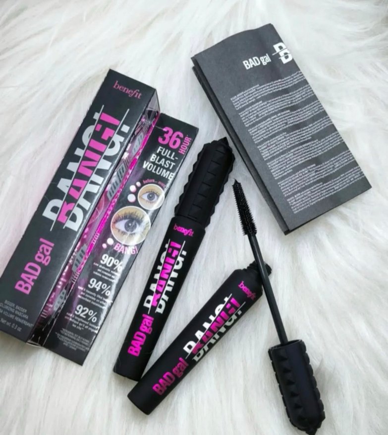 Benefit Bad Gal Bang maskara, koyu renk ve tam hacim sağlar. Pembe ve siyah ambalajıyla dikkat çeker.