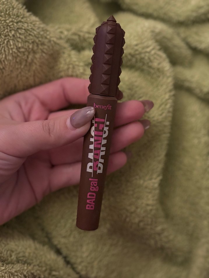 Benefit Badgal maskara, koyu bordo renkte, kavrama kolaylığı sağlayan dokulu kapaklı. Kirpikleri zengin renk ve hacimle belirginleştirir.