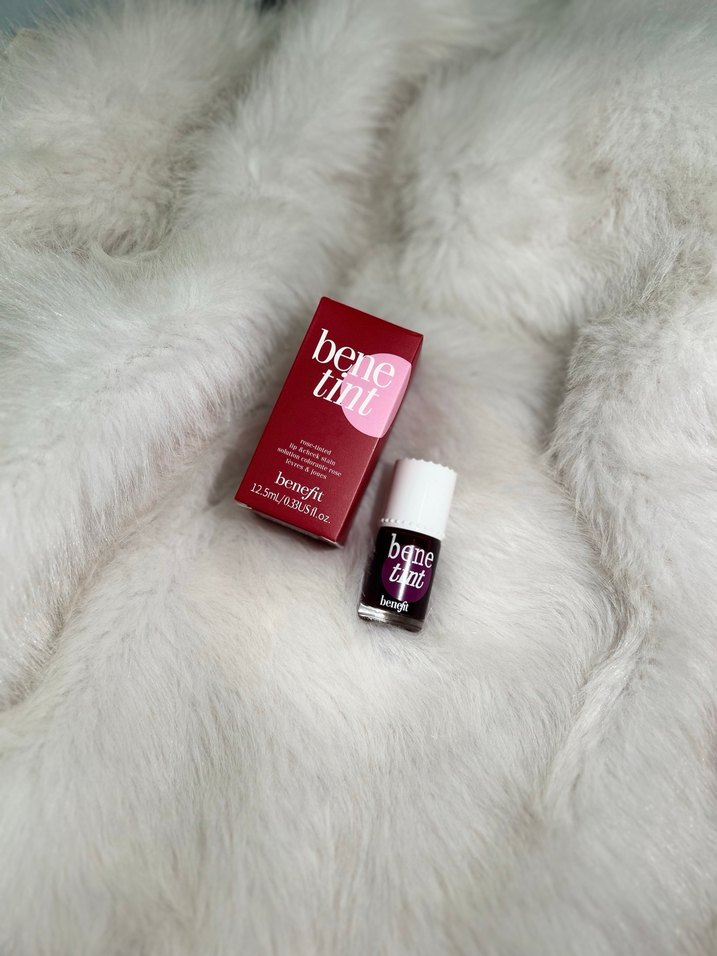 Benefit Bene Tint bordo renkli, doğal bir görünüm sağlayan sıvı allık. Küçük beyaz kapaklı şişede.