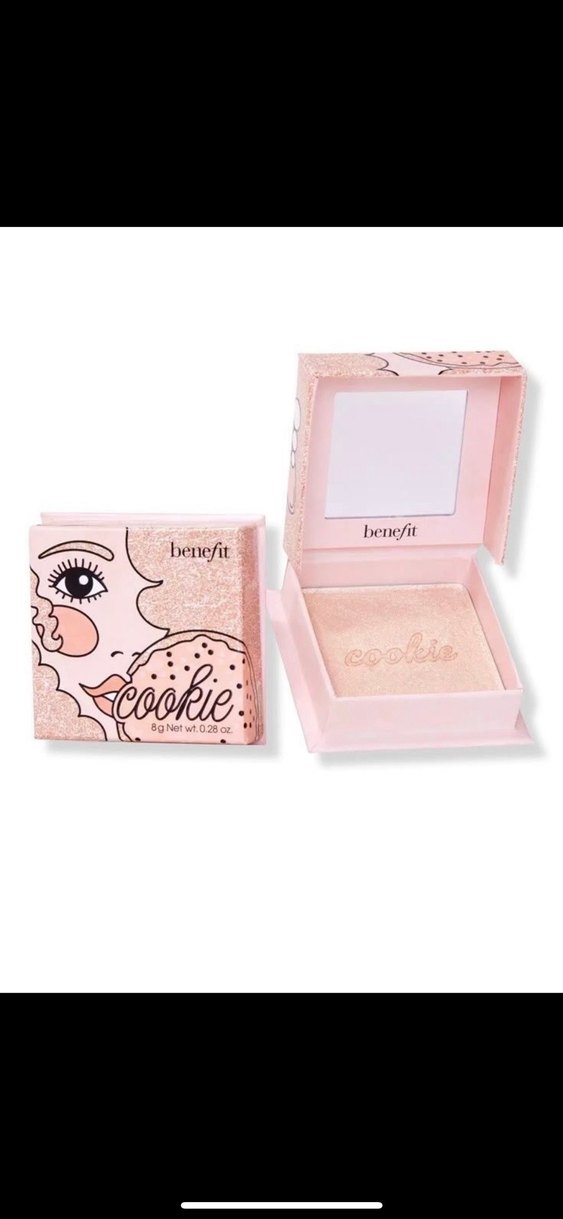 Benefit Cookie açık pembe tonunda, pürüzsüz dokulu allık. Kompaktta ayna bulunur ve üzerinde 'cookie' yazısı kabartmalıdır.