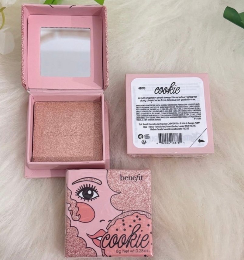 Benefit Cookie allık, pastel pembe tonlarda yumuşak altın şeftali rengi ve hafif ışıltı sunar. 8g ağırlığında, kompakt kutusunda ayna bulunur.
