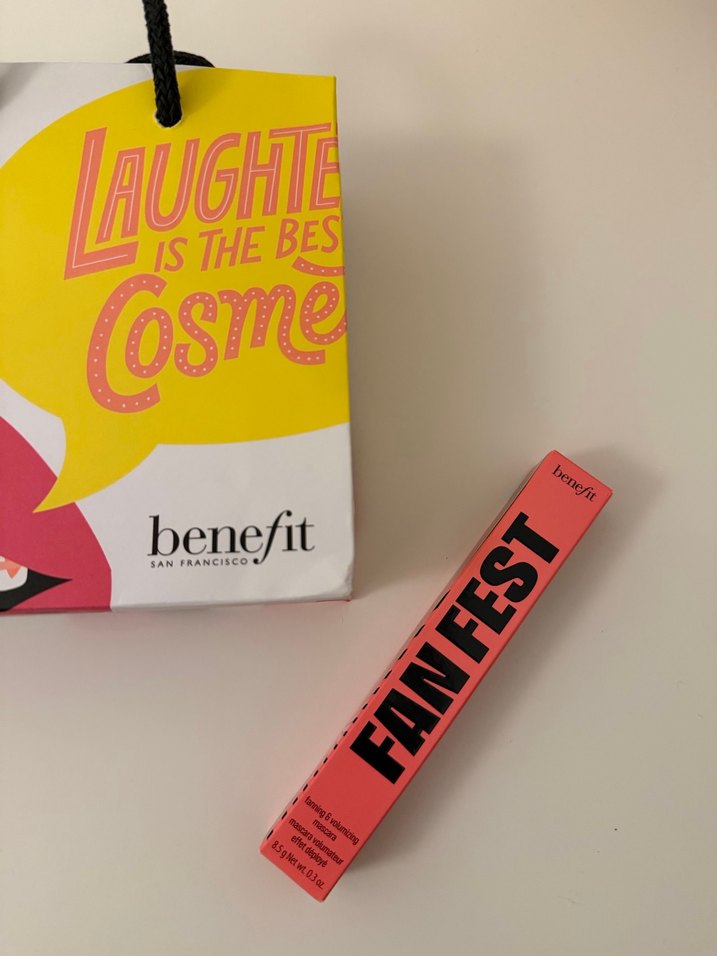 Benefit FanFest markalı, Siyah maskara. Kutusu mercan renginde, üzerinde siyah büyük harflerle yazılar bulunur.