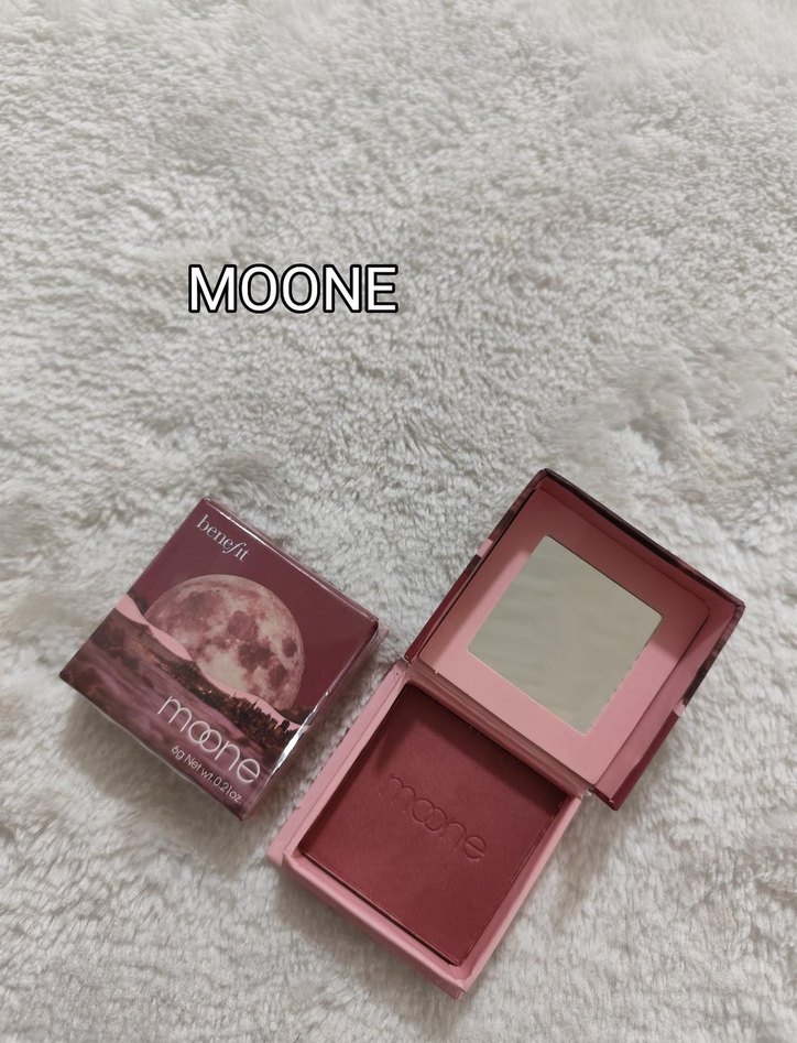 Benefit Moone markasına ait koyu bordo tonunda, yumuşak dokulu allık. İçinde ayna bulunan kompakt kutuda.