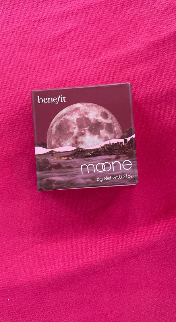 Benefit markasına ait, parlak pembe renkte 6 gram ağırlığında Moone allık.