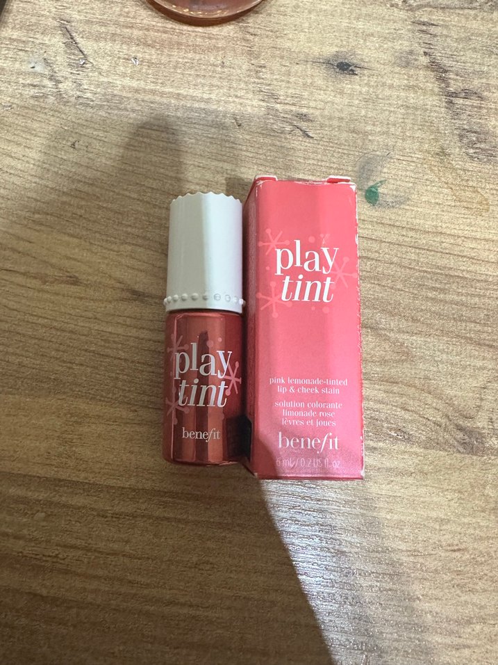 Benefit Play Tint, dudaklar ve yanaklar için açık pembe renk veren küçük ve kullanımı kolay bir şişede. Doğal ve taze bir görünüm sağlar.