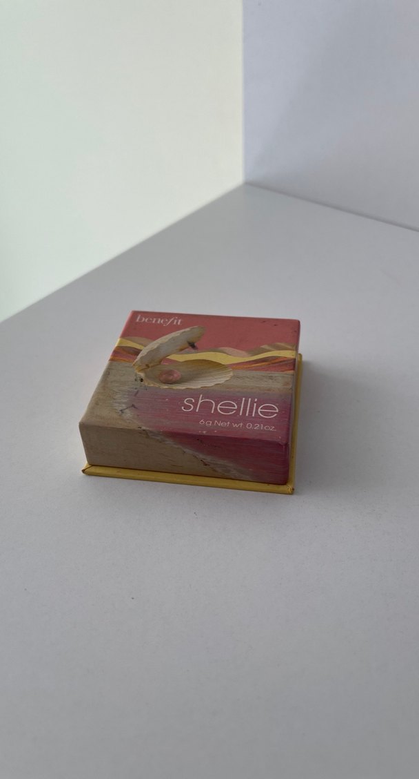 Benefit Shellie parlak bej renkte 0.21 oz içerikli allık. Ambalajı dekoratif bir tasarıma sahiptir.