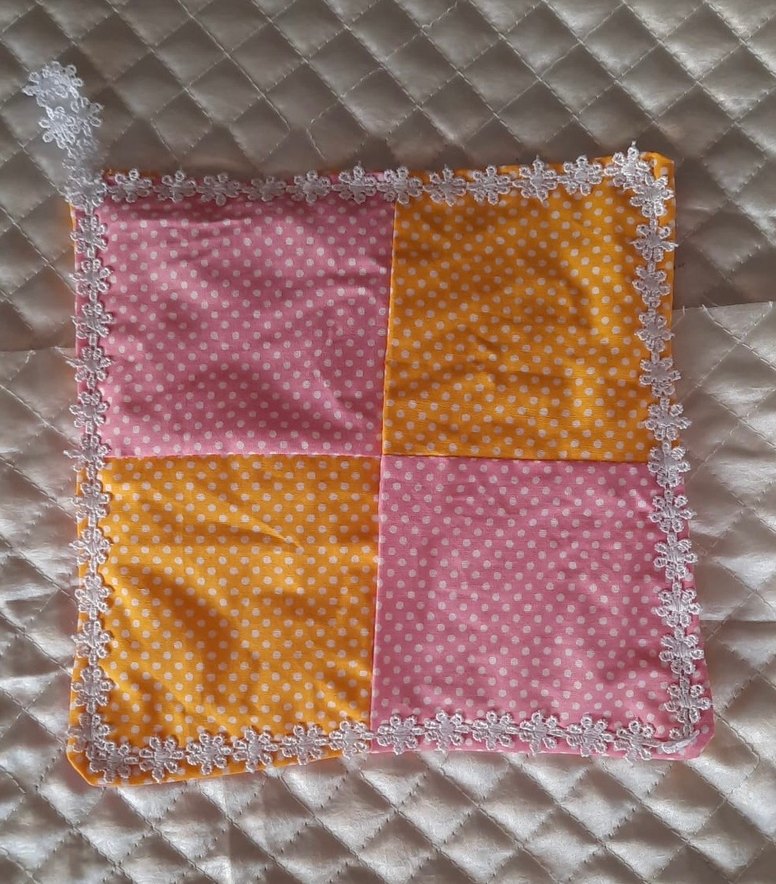 Pastel pembe ve turuncu karelerden oluşan, beyaz puantiyeli fırın tepsisi tutacağı zarif beyaz işlemeli çiçek kenar süslemelerine sahiptir.