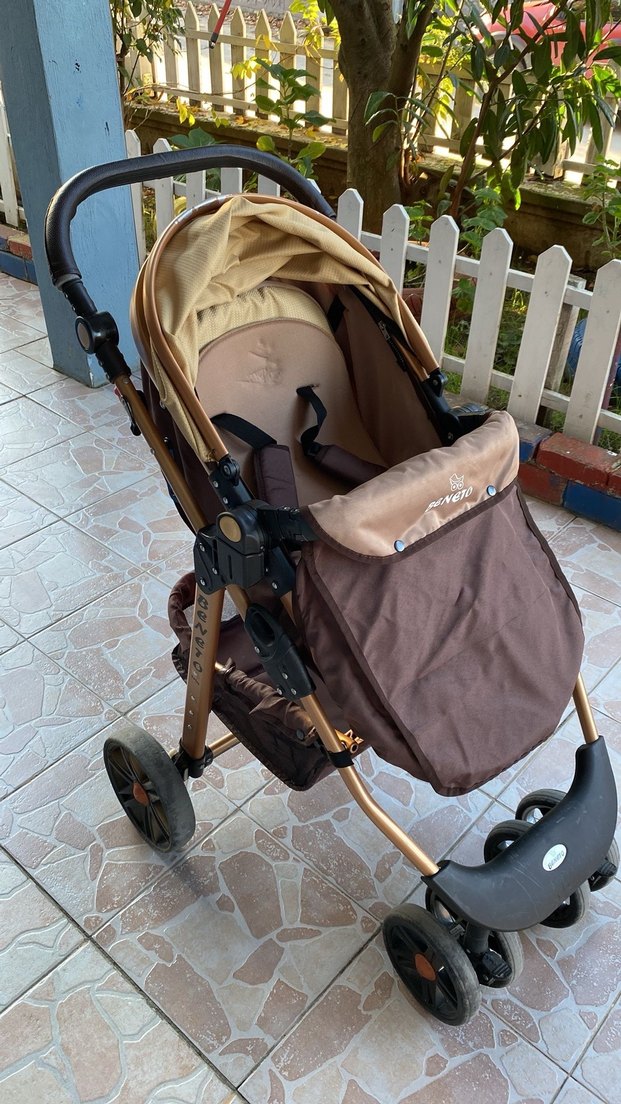 Ayarlanabilir tente ve emniyet kemeri bulunan koyu kahverengi bebek arabası. Dayanıklı tekerlekler ve alt kısımda saklama sepeti içerir.