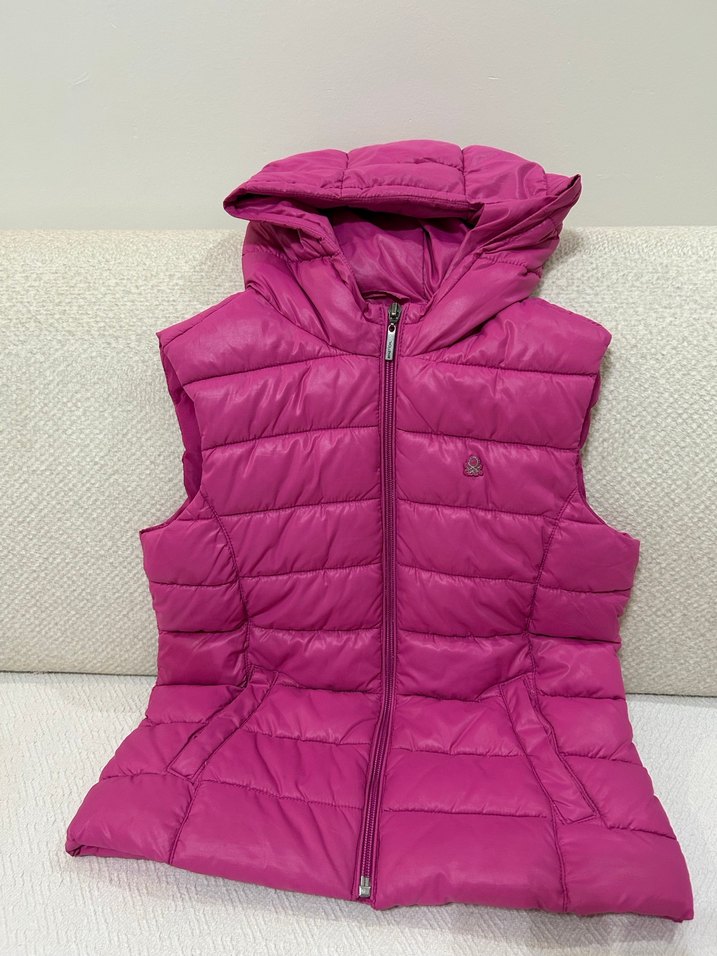 Parlak pembe renkte, sentetik kumaştan yapılmış, fermuarlı ve yüksek yakalı, kolsuz şişme çocuk yeleği. Rahat ve şık, normal boyda, günlük kullanım için uygun.