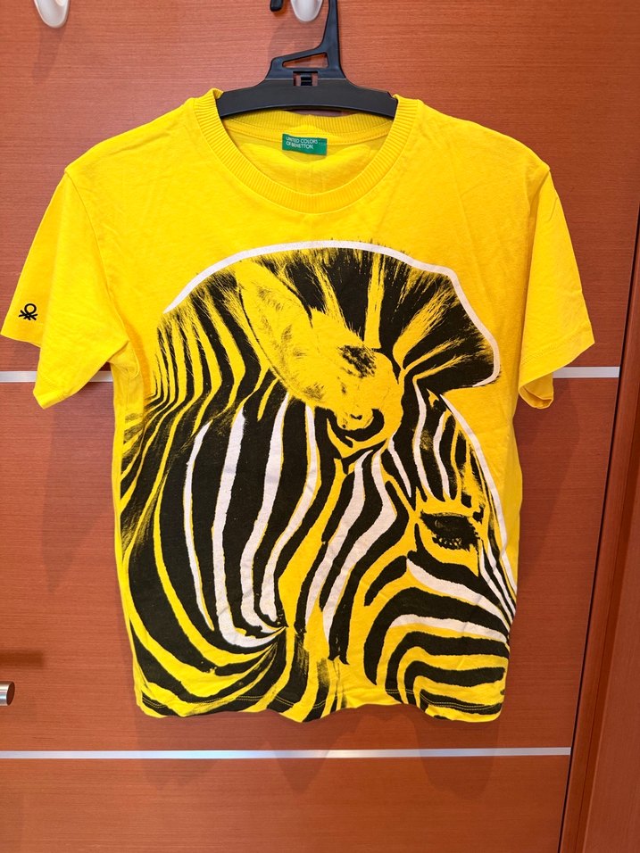 United Colors of Benetton, içinde L beden 8-9 yaş yazsa da 7 yaş gibi düşünülmeli, sarı zemin üzerine siyah beyazlı zebra kafası ve sağ kolunda Benetton logo detaylı, sayılı giyilmiş, kısa kol canlı sarı çocuk tişört. #benetton #kids #zara #mango