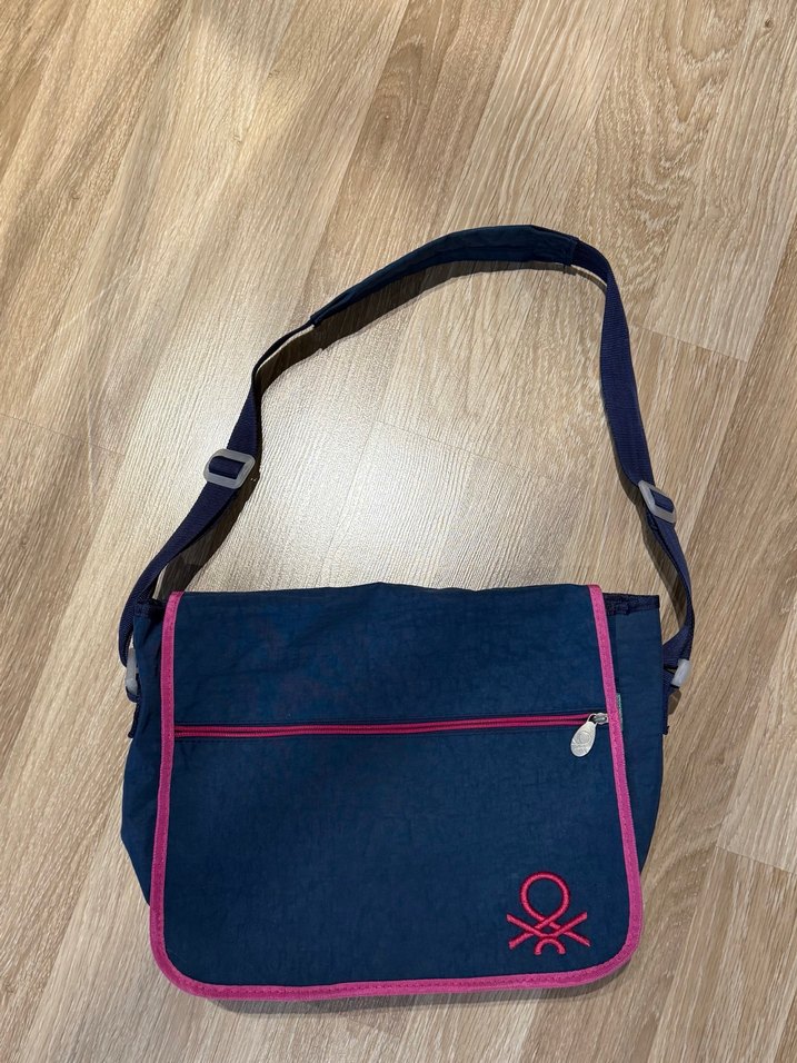 Pastel lacivert renkli, baskılı desenli postacı çantası. Önde fermuarlı cep ve ayarlanabilir askısı bulunur.