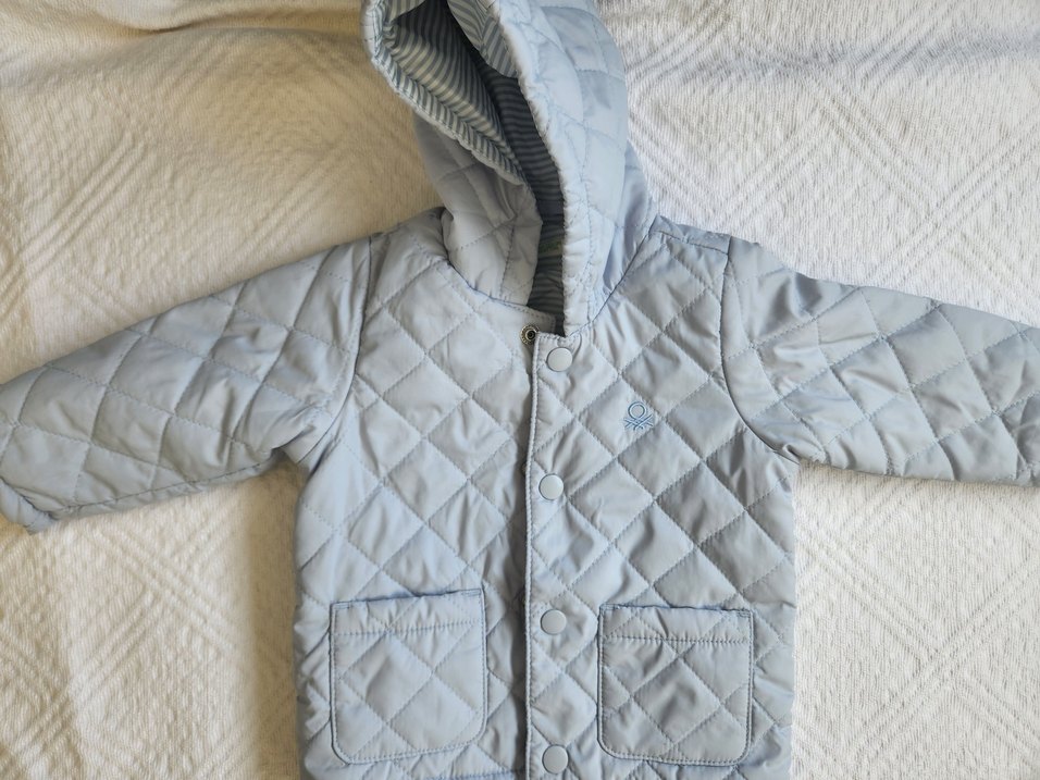 Düğmeli ve kapüşonlu, yumuşak ve sıcak kumaştan yapılmış gri erkek çocuk montu. Sokak stiline uygun, dar kesim ve kapitone detaylı.