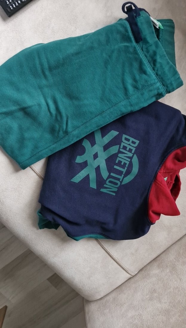 Benetton marka, rahat kesim, koyu mavi ve yeşil renklerde, yumuşak ve sıcak kumaştan üretilmiş erkek çocuk eşofman takımı. Üstünde crew neck ve logo bulunur.