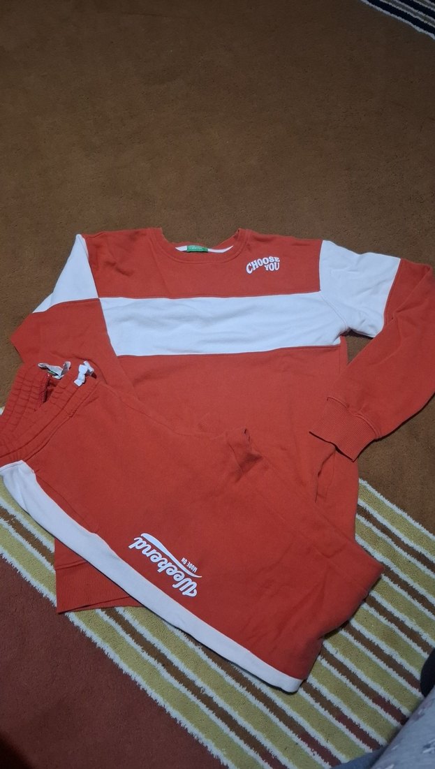 Renkli, bol kesim ve bisiklet yakalı erkek çocuk eşofman takımı. Yumuşak ve sıcak kumaştan, sade tasarımlı, beyaz şerit detaylı, rahat ve şık sokak stili. Benetton eşofman takımı