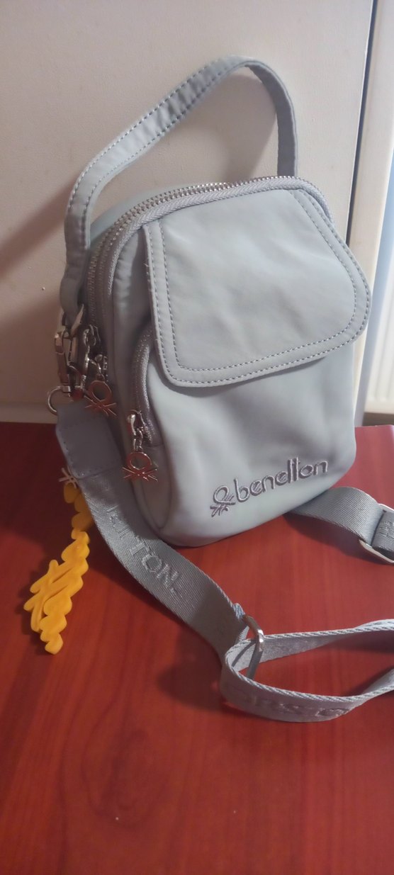 Benetton markalı gri deri kadın çapraz çanta, tokalı tasarımı ve baskılı deseniyle dikkat çekiyor. Sokak stiline uygun, günlük kullanıma ideal, trend bir parça. Kayışında 'obenellon' yazısı bulunur.