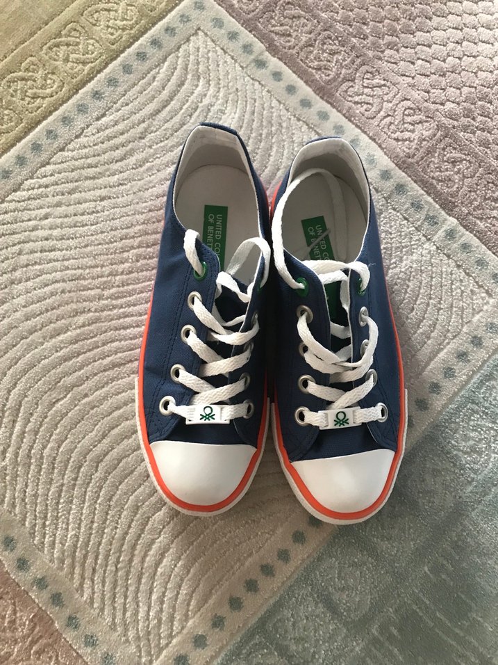 Sadece bir kaç kez evde giyildiBenetton kadın sneaker, elastik detaylı ve renkli tasarımlı mavi model. Dayanıklı kauçuk malzemeden üretilmiştir, trend sokak stili için uygundur.