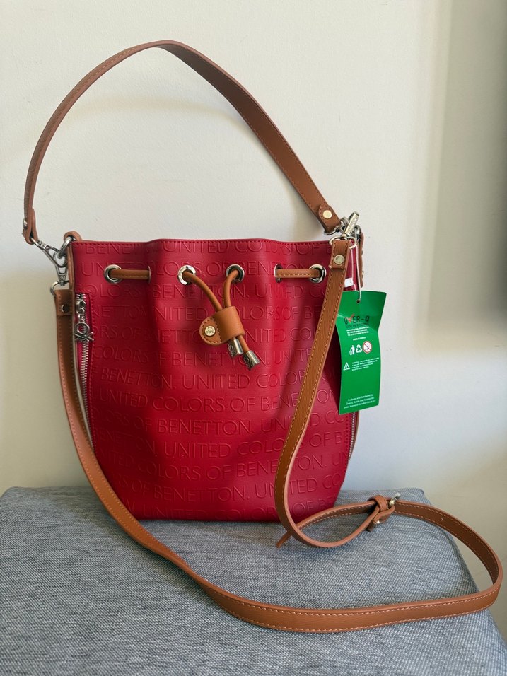 Benetton kırmızı deri kadın çanta, baskılı logo deseni ve kemerli tasarıma sahip. Ayarlanabilir kayışlarla sokak stili için uygun. Çanta orijinal sıfır etiketli .