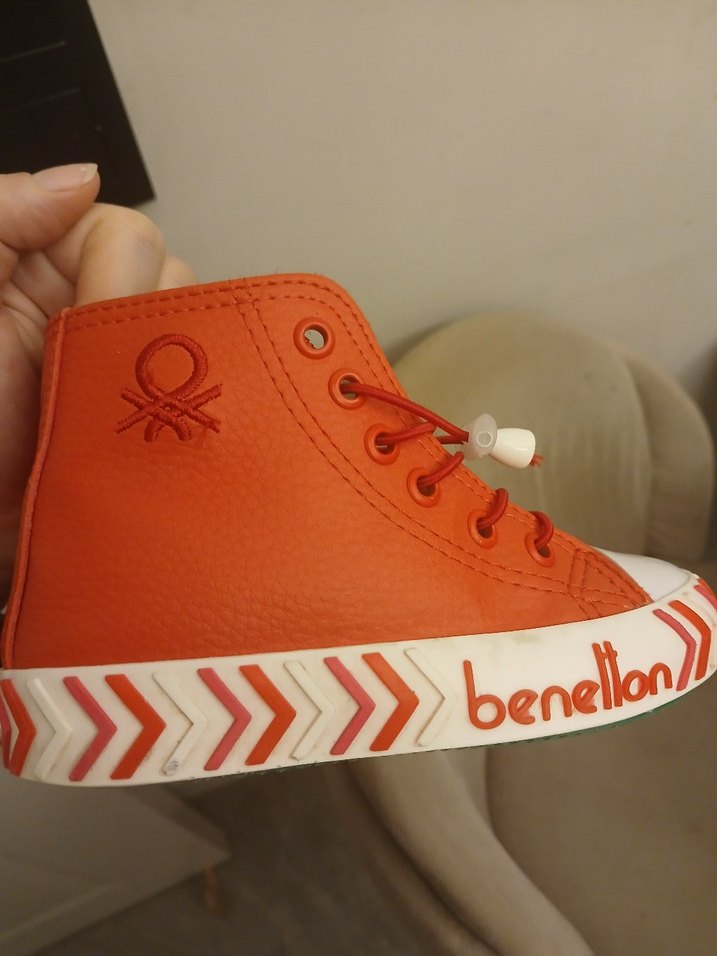 Benetton markalı, renkli ve baskılı desenlizı erkek çocuk spor ayakkabısı, lastik tabanlı ve tokalı tasarıma sahiptir.