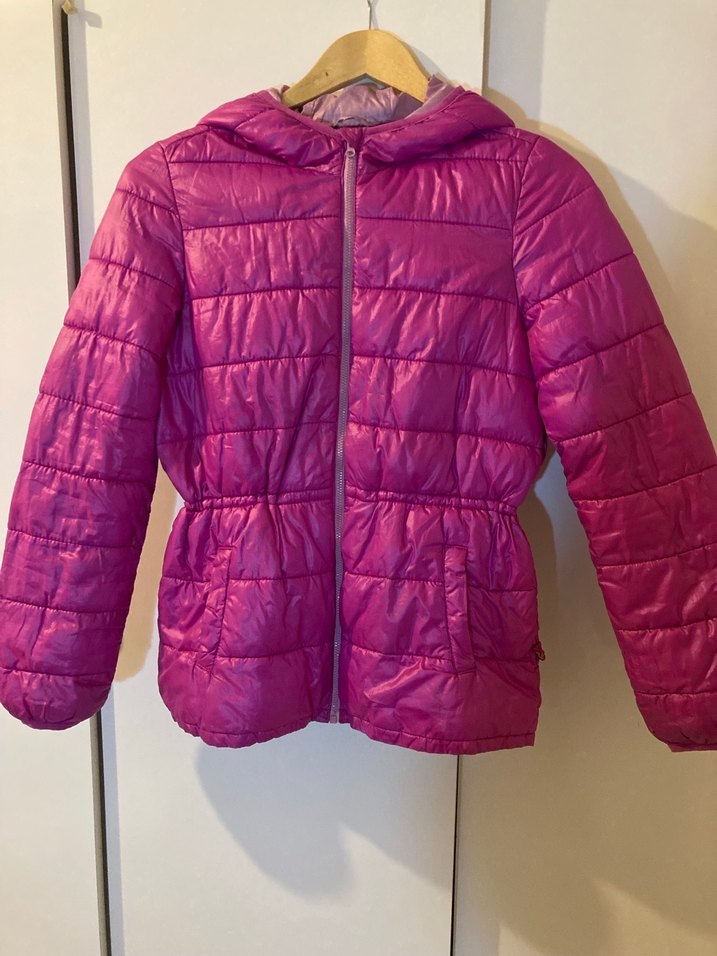 Parlak pembe renkli, fermuarlı ve kesimli yapıya sahip kız çocuk montu. Belden sıkmalı. Yumuşak ve sıcak kumaştan, ufak bir kopuğu var fotoğrafta belirttim düzeltilebilir. İlgilenirseniz tam ölçülerini verebilirim.