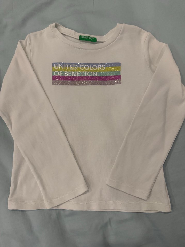 Benetton kız çocuk uzun kollu tişört, bisiklet yaka ve önünde çok renkli simli logo baskısı vardır. Yumuşak pamuk ve rahat kesimle günlük sokak stili için uygundur. Boyu 38 cm,eni 32cm,kol boyu 38cm,%100 pamuk.