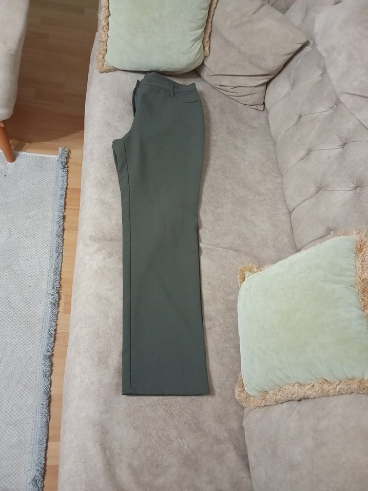 haki renkte, kemerli, normal boy kumaş pantolon. Sentetik kumaştan üretilmiş, ofis için günlük uygun, rahat kesim.