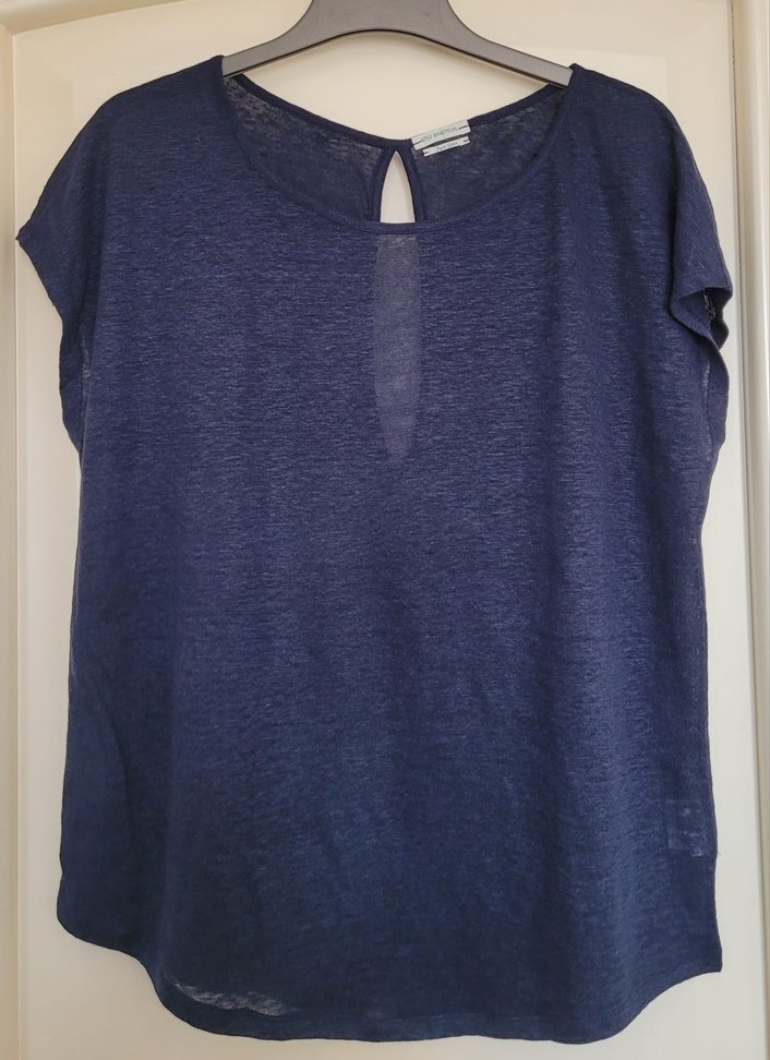 Benetton Lacivert kayik yakalı ve kısa kollu bluz. Sırtında damla şeklinde derin bir dekoltesi vardır. %100 keten, hafif ve ince yüksek kalite, eteği oval kesim, iki koltuk arası 50cm, boyu 64cm, hiç kullanılmamıştır #benetton #bluz #keten #hafif