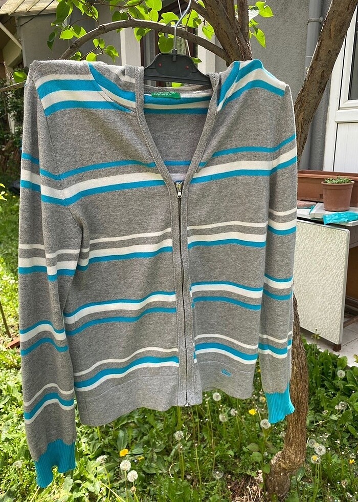 Benetton mavi beyaz gri çizgili triko hırka