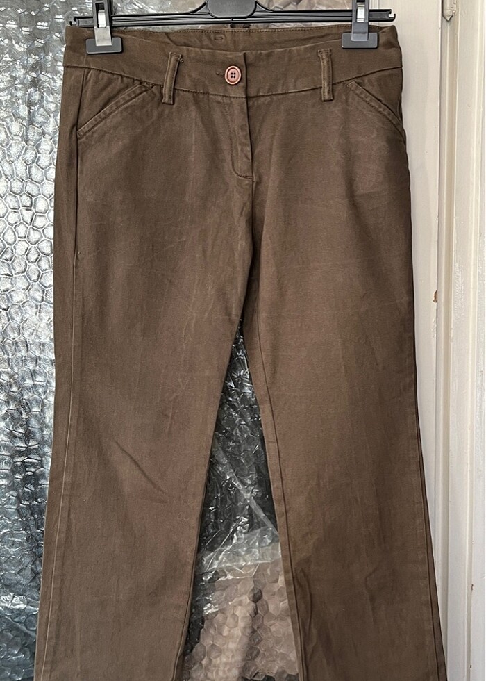 Benetton marka haki- kahve renkte yan ve arka cepleri olan pamuklu kumaştan sonbahar/kış için ideal bir pantolon. Bedeni 42 olarak geçiyor ama markanın kalıpları çok dar olduğu için etiketteki bedeni değil ölçüleri dikkate almanızı öneririm. Ölçüleri bel çevresi 80 cm, boyu 94 cm.