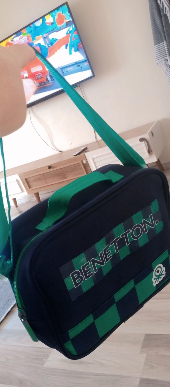Parlak yeşil renkte, BENETTON yazılı çocuk okul çantasıdır. Ayarlanabilir askısı ve kullanışlı depolama alanı vardır.