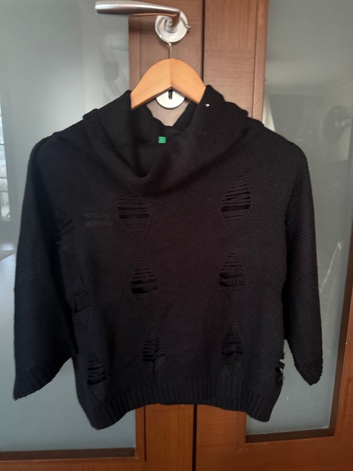 Siyah renkli, boğazlı, uzun kollu, gevşek kesim örgü kazak. Kısa boyda ve gotik tarzda, yırtık detaylara sahip. M beden.