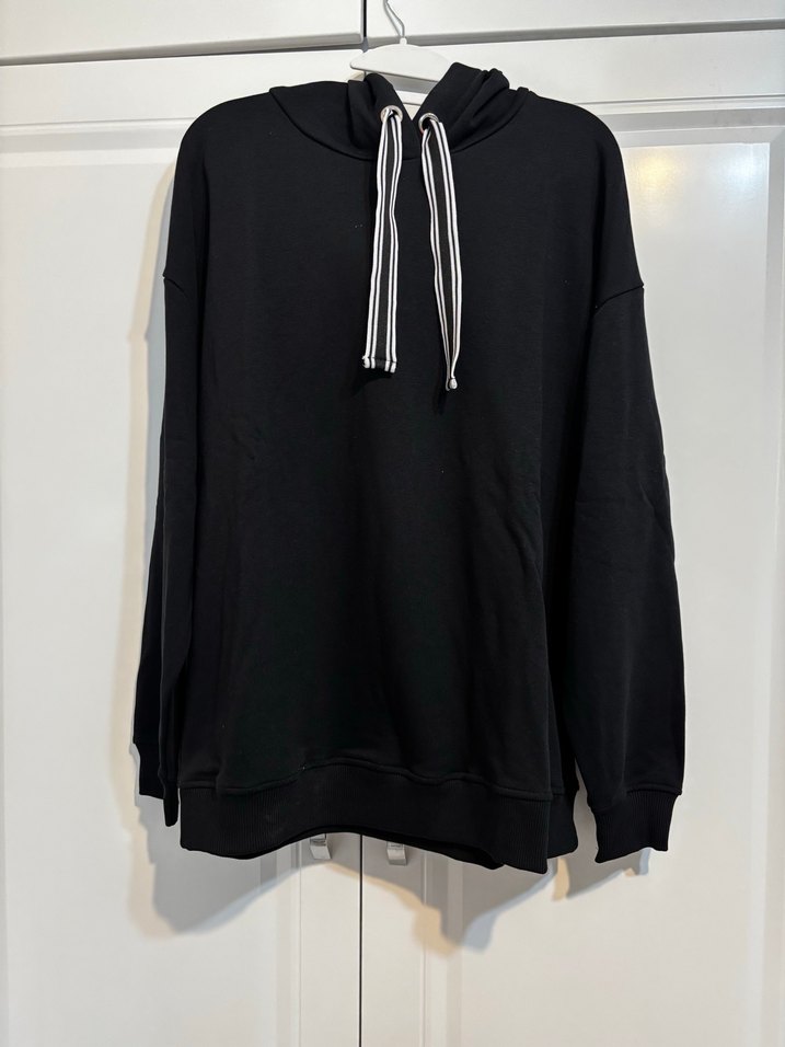Siyah kapüşonlu sweatshirt, rahat kesimi ve uzun kollarıyla yumuşak ve sıcak kumaştan üretilmiştir. Günlük kullanım için sade ve şık tasarıma sahiptir.