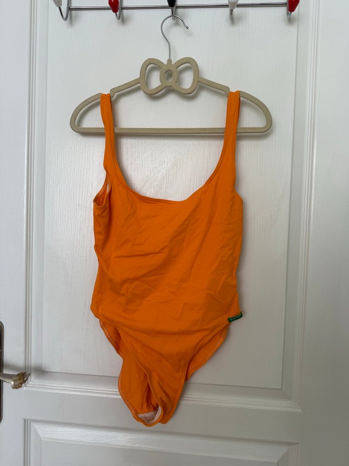 askılı, turuncu renkte, vücuda oturan kadın mayo, plaj için minimal ve trend bir tarz sunar.