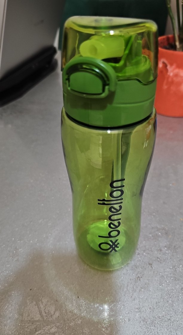 Renkli yeşil Benetton çocuk matara, güvenli kapak ve dayanıklı yapıya sahiptir, günlük su tüketimi için uygundur.