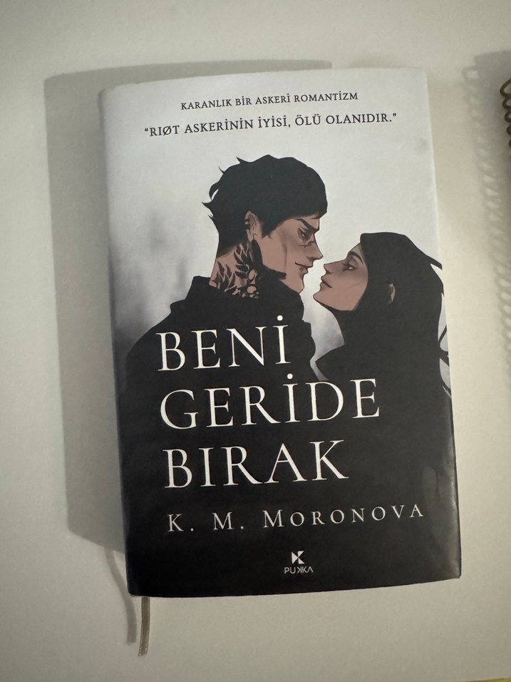 K.M. Moronova'nın "Beni Geride Bırak" adlı romanı, karanlık askeri romantizmi ve fedakarlık temalarını işler. Elimde iki tane var ve ciltli içinde ayraç ve birer kartı var