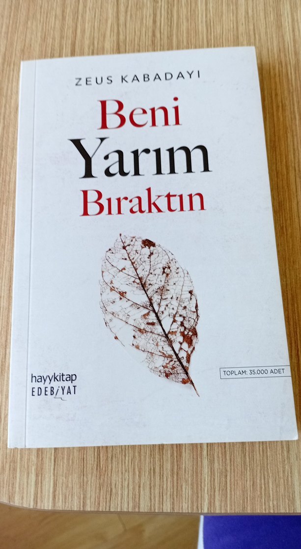 Zeus Kabadayı'nın "Beni Yarım Bıraktın" adlı şiir kitabı, sade bir kapak ve yaprak görseli içerir. Hayykitap yayınevinden çıkmıştır.
