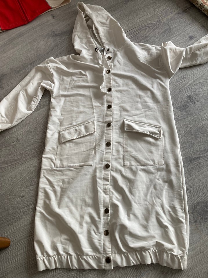 Düğmeli, beyaz kadın kabanı, bol kesim ve uzun kolludur. Yumuşak keten kumaştan yapılmıştır, çentikli yakası ve ön cepleri vardır, günlük rahat kullanım için uygundur. İki kol arası 55 omuzdan boy 98 cm tertemiz sorunsuz