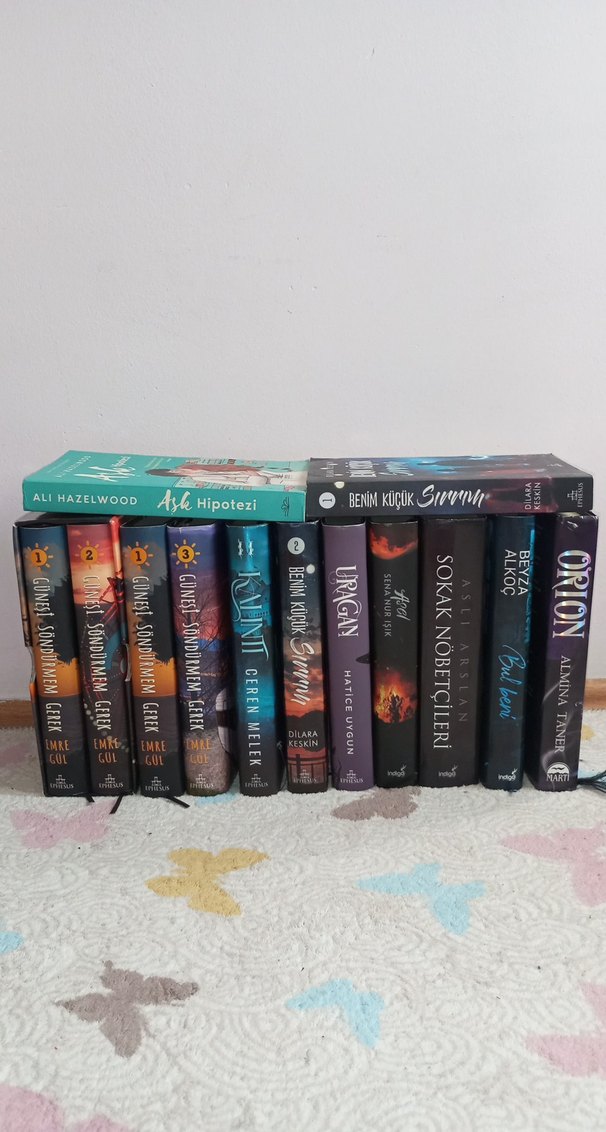 2 tane ciltsiz var diğerleri full ciltli -SIFIRLAR- Benim küçük sırrım 1 Güneşi Söndürmem gerek serisi (imzalı-posterli-ayraçlı-kutulu)(İki tane 1. kitap var) Urağan Orion(imzalı) Bul Beni (ayraçlı) Asel(imzalı) -ORTA DURUMDA-(ALTI ÇİZİLİ) Aşk hipotezi Kalıntı 2(ayraçlı) Benim küçük sırrım 2(ayraçlı) -HASARLI- Sokak nöbetçileri 1 (fotoda hasarı var) TEKLİFLERİ KABUL EDİYORUM YAZMAKTAN ÇEKİNMEYİN